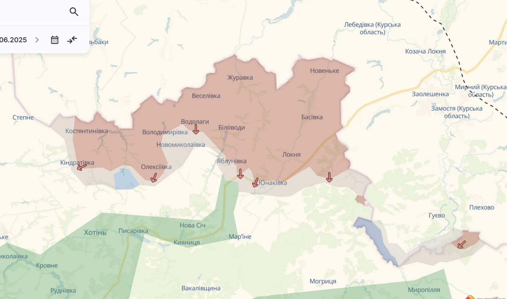 Накануне в DeepState сообщили, что украинские бойцы 225-го отдельного штурмового полка Вооруженных Сил Украины после длительных боев освободили село Андреевка. Главнокомандующий украинской армии Александр Сырский указал, что Силы обороны в приграничном селе Юнаковка продвинулись в течение недели от 200 до 700 метров.