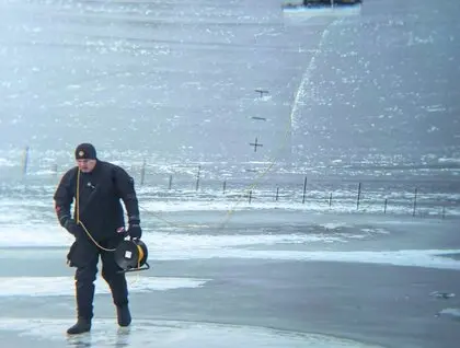 Здесь говорят, что местные жители заметили подозрительный предмет на льду водоема - примерно в 300 метрах от берега. Они сразу позвонили по телефону спасателям.