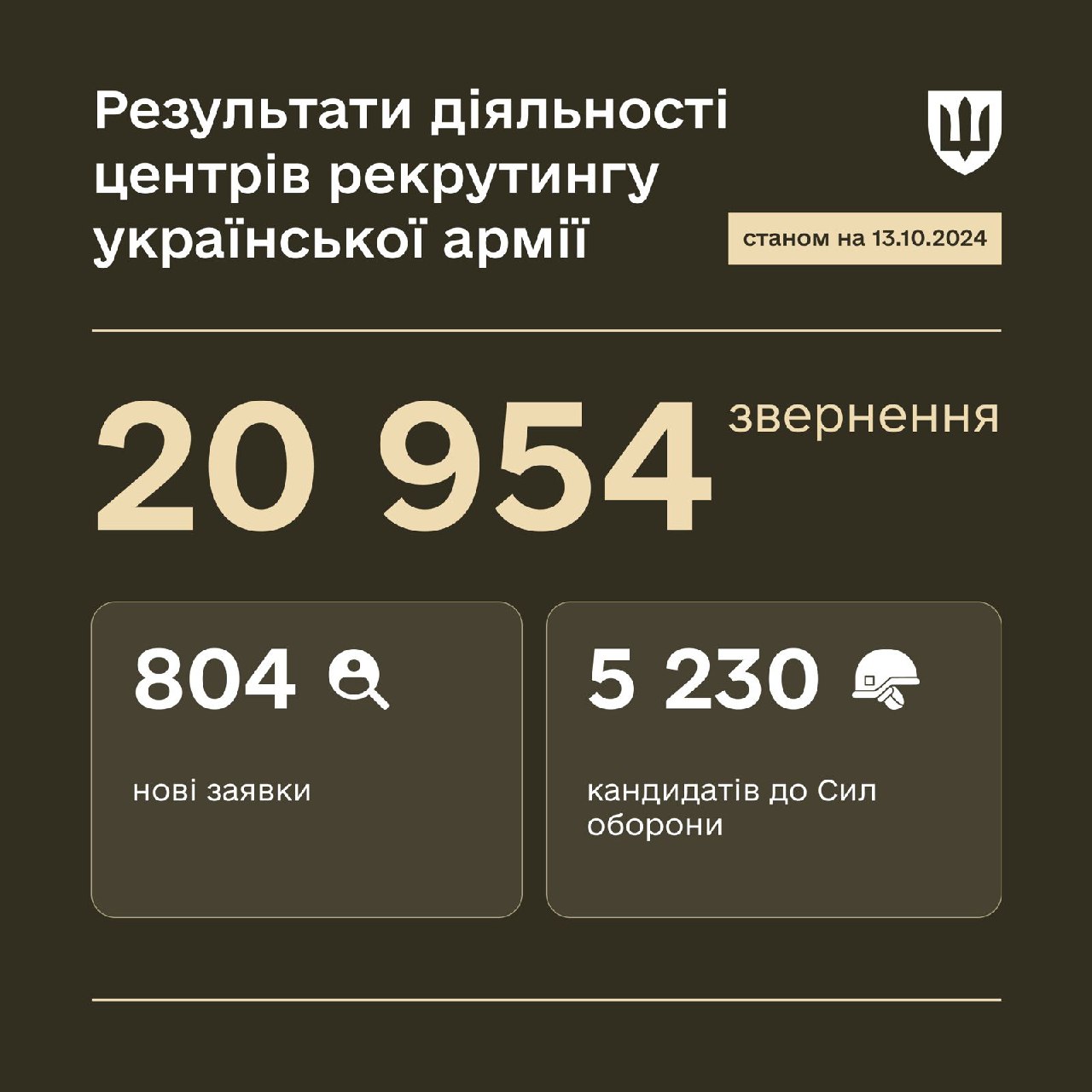 В Минобороны рассказали, что в рекрутинговых центрах желающие присоединиться к войску больше всего интересуются должностями водителей, штабных работников и операторов дронов. В сообщении ведомства говорится, что по состоянию на 13 октября в такие структуры обратилось уже 20 954 человека, 804 — за последнюю неделю.