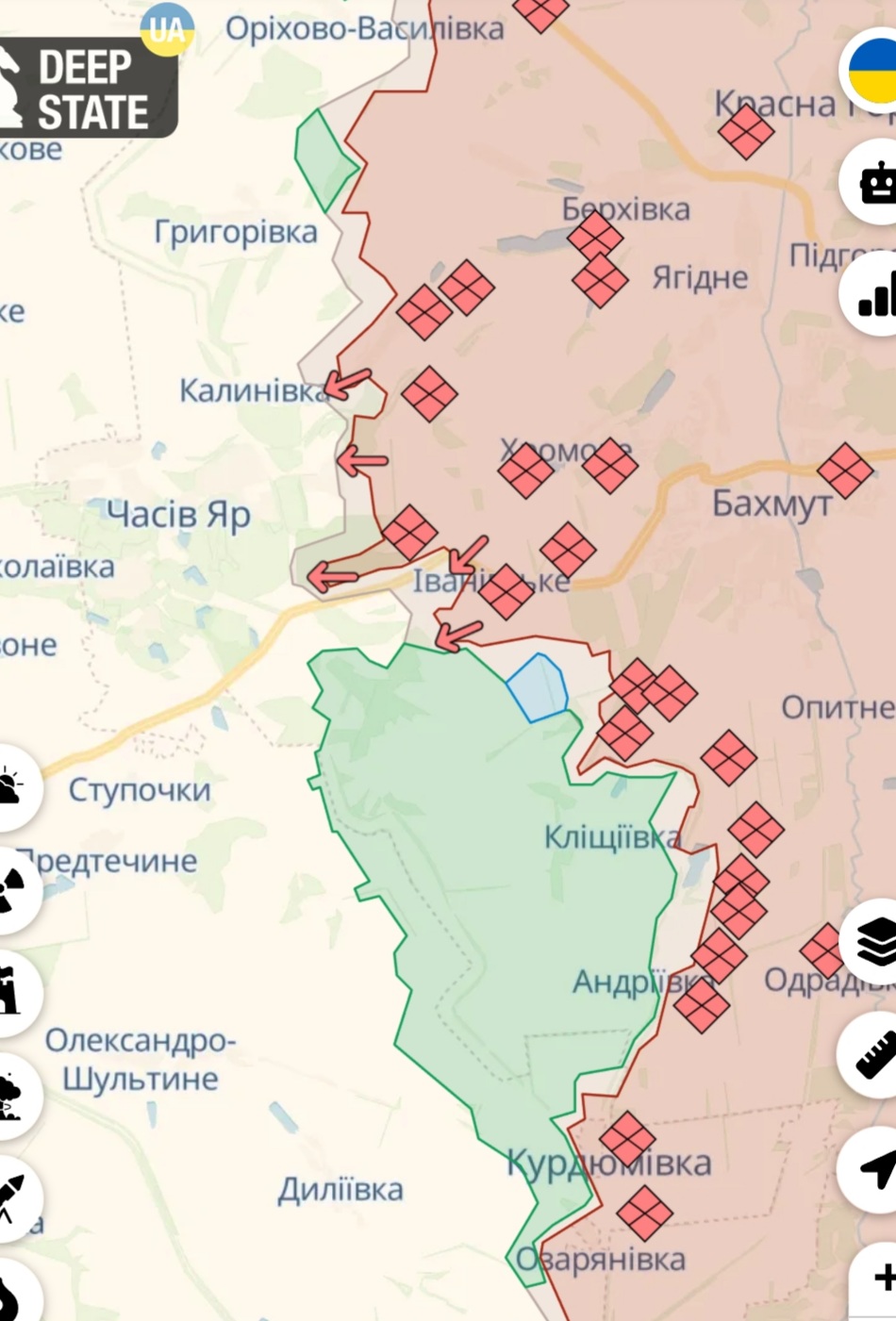Российские войска осуществляют наступательные действия на Часов Яр Донецкой области как в "лоб", так и по флангам, в частности, пытаются продвигаться в направлениях Андреевки и Ивановского.