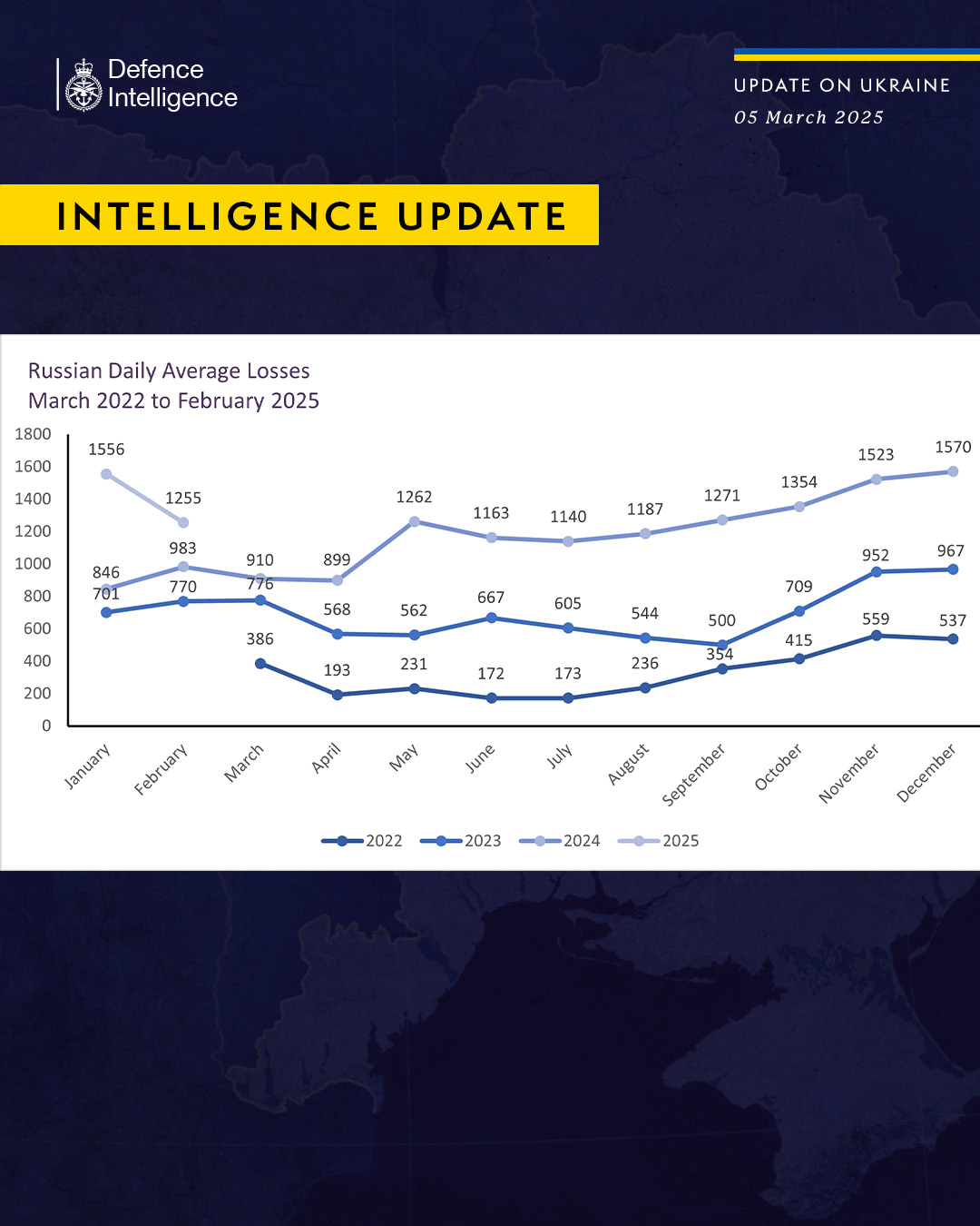 Там также прогнозируют, что в этом месяце количество потерь россиян, вероятно, составит в среднем в день более тысячи солдат, если они будут продолжать свои пехотные атаки на нескольких направлениях фронта.
