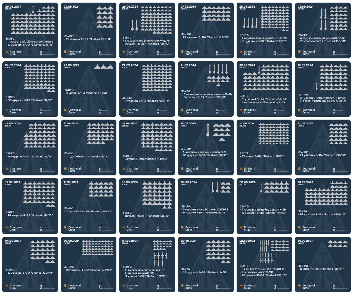 В ночь на понедельник, 30 сентября, Украину атаковали 73 "Шахеда", ракеты "Искандер-М", Х-59/69, и Х-31П. Силы ПВО уничтожили 68 воздушных целей.