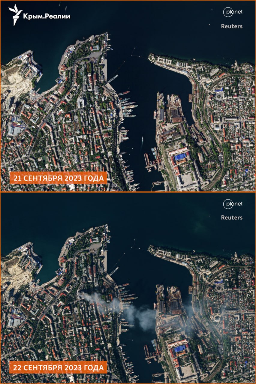 В издании показали снимки американской компании Planet Labs с 21 сентября по 22 сентября, после ракетного удара видно, что здание штаба было серьезно повреждено.