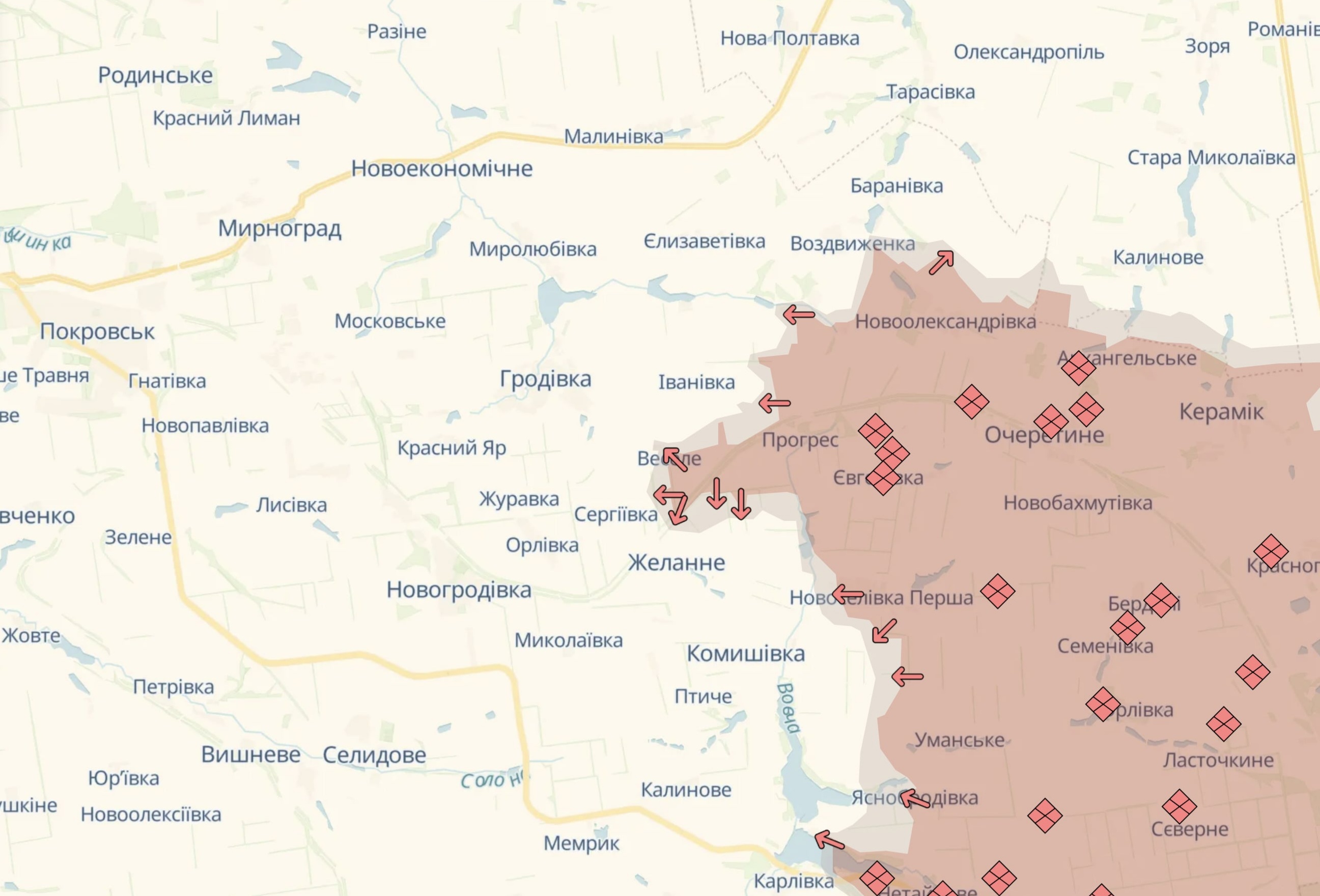 "Пока дистанция дает нам возможность остановить врага, чтобы он не дошел к Покровску. Если посмотрим на карту, мы видим, что перед Покровском есть Гродовка, Мирноград. Здесь можно говорить, что именно Мирноград расположен на участке 12 км от линии фронта, туда уже долетают снаряды от САУ, реактивных систем залпового огня, кассетные снаряды, управляемые авиационные бомбы. Большая опасность именно для этого города, а после Мирнограда — Покровск", - подчеркнул военный.