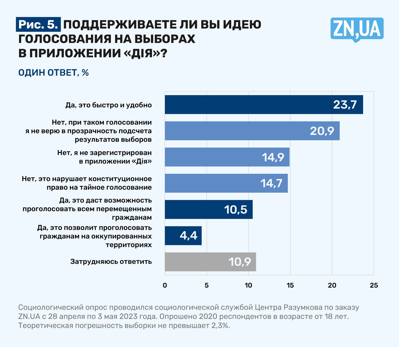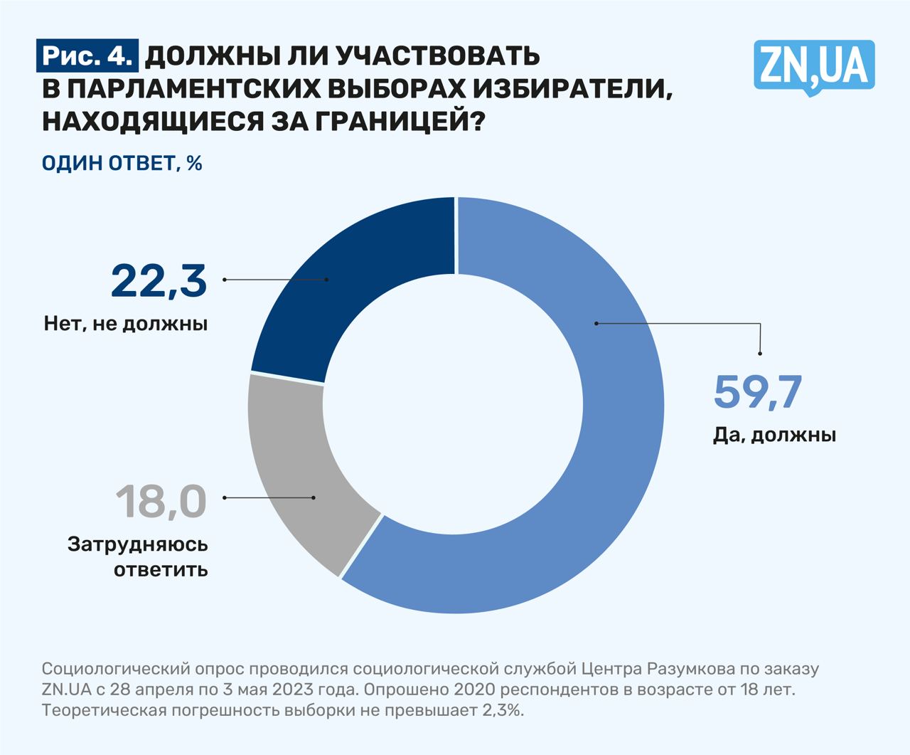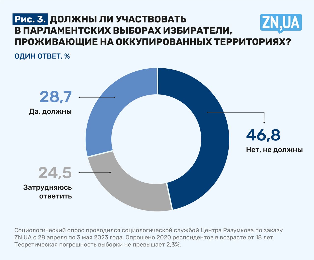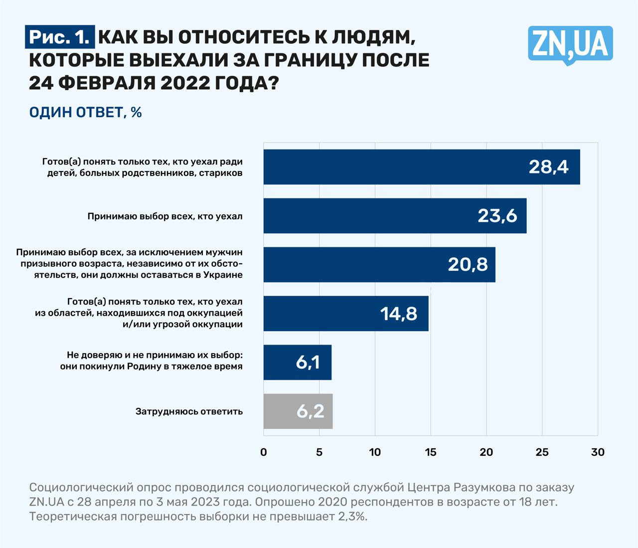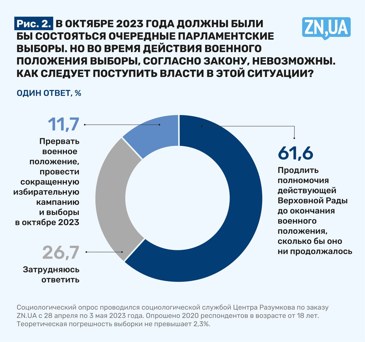 Опрос проводился Центром Разумкова по заказу ZN.UA с 28 апреля по 3 мая 2023 года методом face-to-face в 22 областях Украины и г. Киеве. Опрошены 2020 респондентов в возрасте от 18 лет. Теоретическая погрешность выборки не превышает 2,3%.