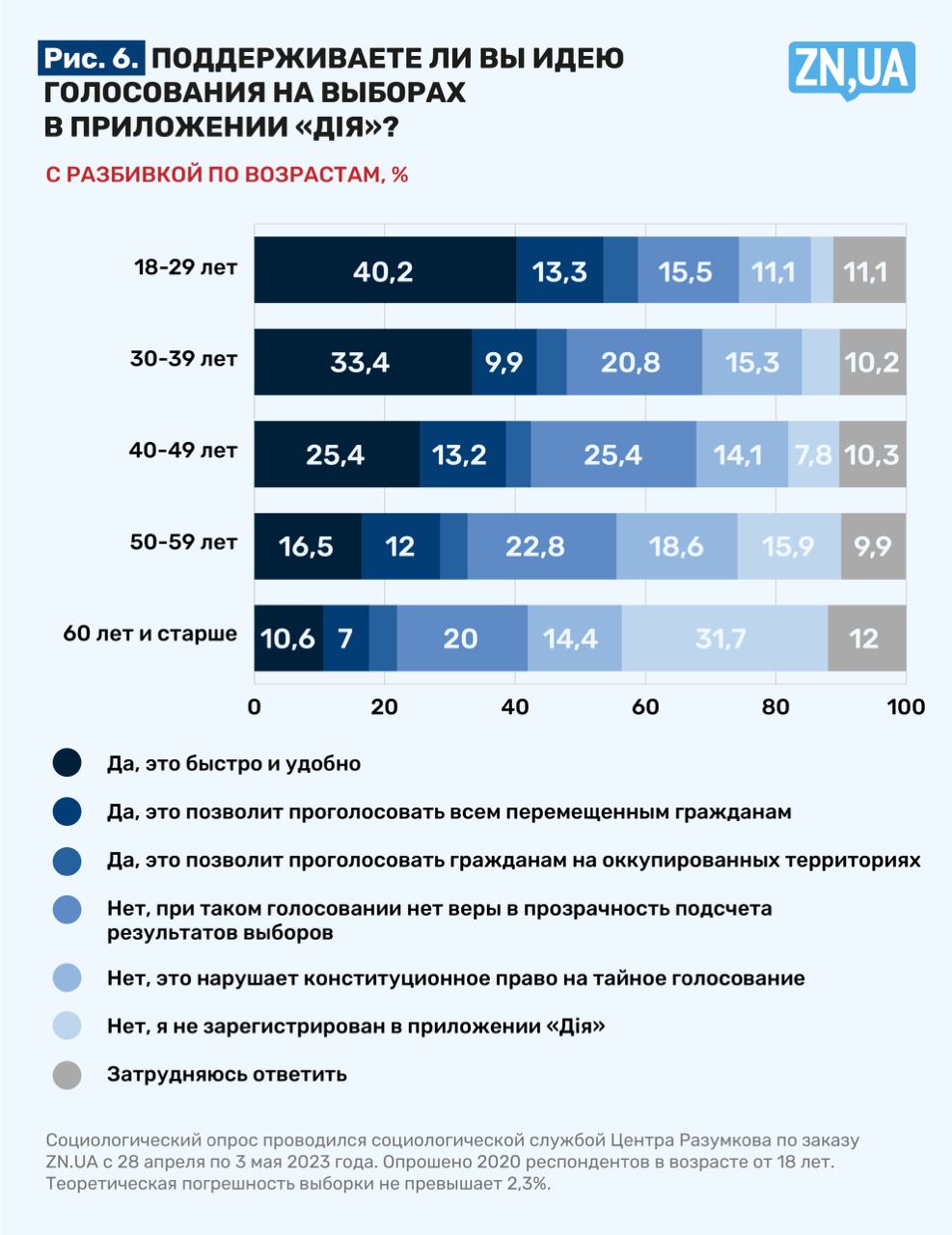 Тема голосования через платформу широко обсуждается только в узких кругах. У людей, которые, по сути, в первый раз столкнулись с таким вопросом, не было времени задуматься. Поэтому при всей любви к сервису и отдавая должное главе Минцифры Федорову и его команде, сделавшим много полезного во время войны, всего 23,7% опрошенных с разгона готовы голосовать в «Дії». Не удивительно, что подавляющее большинство из них (73,6%) — это молодежь от 18 до 39 лет. 10,5% являются приверженцами электронного голосования, потому что так «могут проголосовать все перемещенные лица». 4,4%, размышляя на эту тему, вспомнили о правах жителей оккупированных территорий, которым «Дія» также может дать возможность выразить свое мнение.