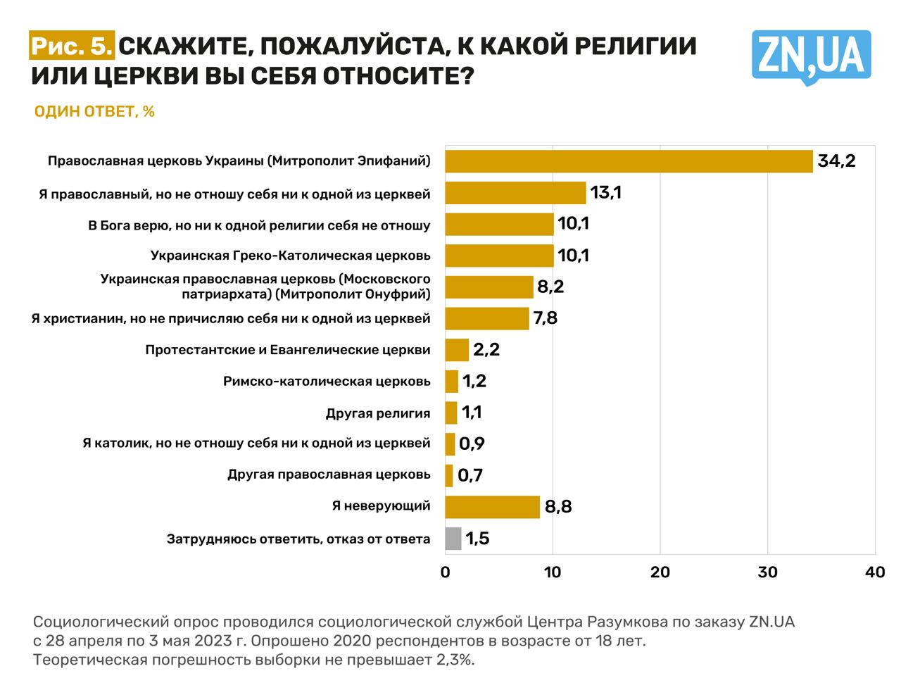 Война внесла свои коррективы. И в популярность армии, которая выросла на фоне сначала гибридной войны, а после полномасштабного вторжения — утвердилась на первом месте в рейтинге доверия. И в популярность церкви, которая с первых строк рейтингов «сползла» вниз (10-е место в опросе, проведенном Центром Разумкова по заказу ZN.UA в апреле-мае 2023 года).