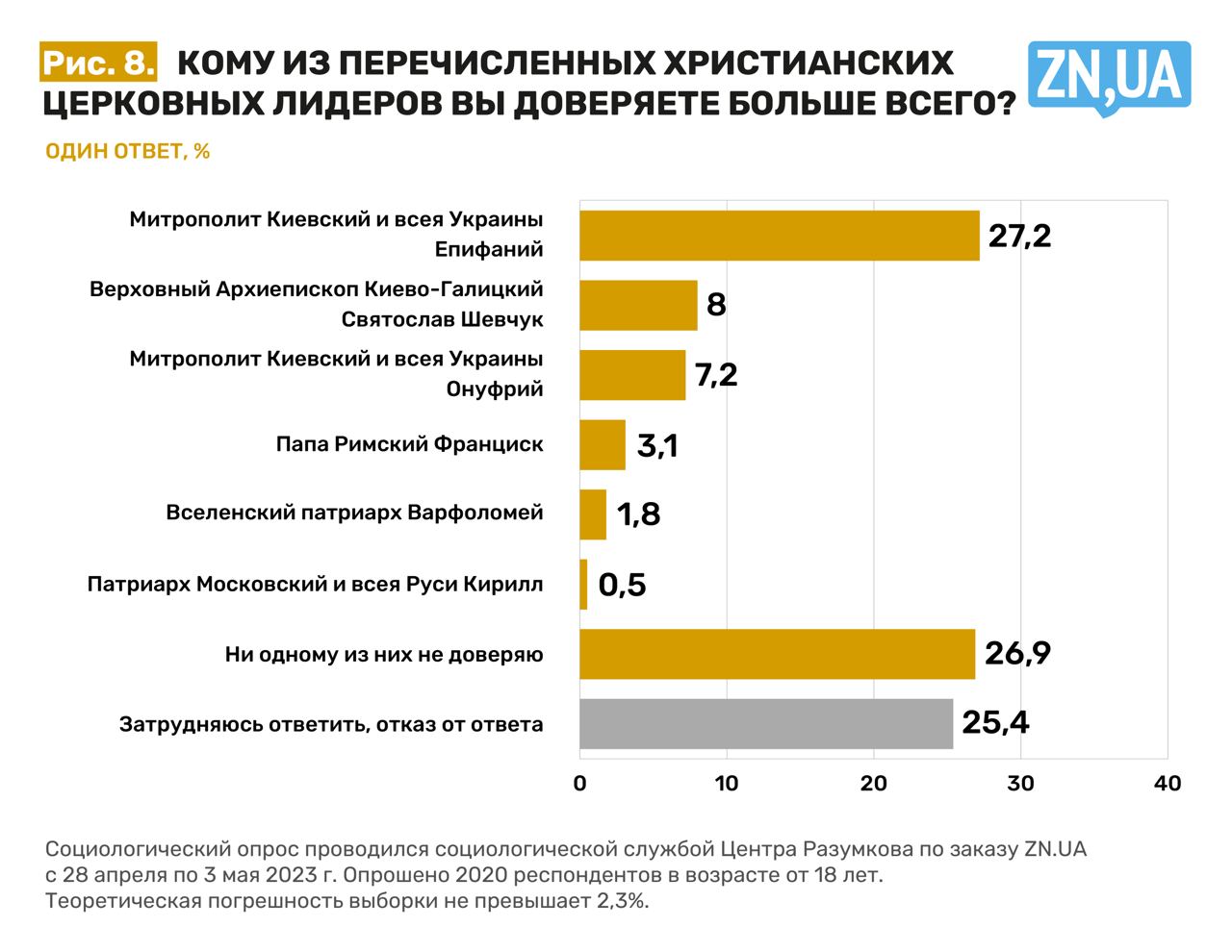 В этом соцопросе была зафиксирована и утрата церковью статуса «безусловного авторитета». Если еще два-три года назад большая часть украинцев могла выбрать среди церковных лидеров кого-то, вызывающего доверие, то в ходе нынешнего опроса выяснилось, что 52% опрошенных либо не доверяют ни одному из глав церквей (27%), либо не могут/отказываются отвечать на этот вопрос (25%) (см. рис. 8). Доверие в наши непростые времена не даруется просто так — оно требует реальных оснований, выраженных конкретными делами, а не просто фактом принадлежности к какому-то, пусть даже сакральному, институту.
