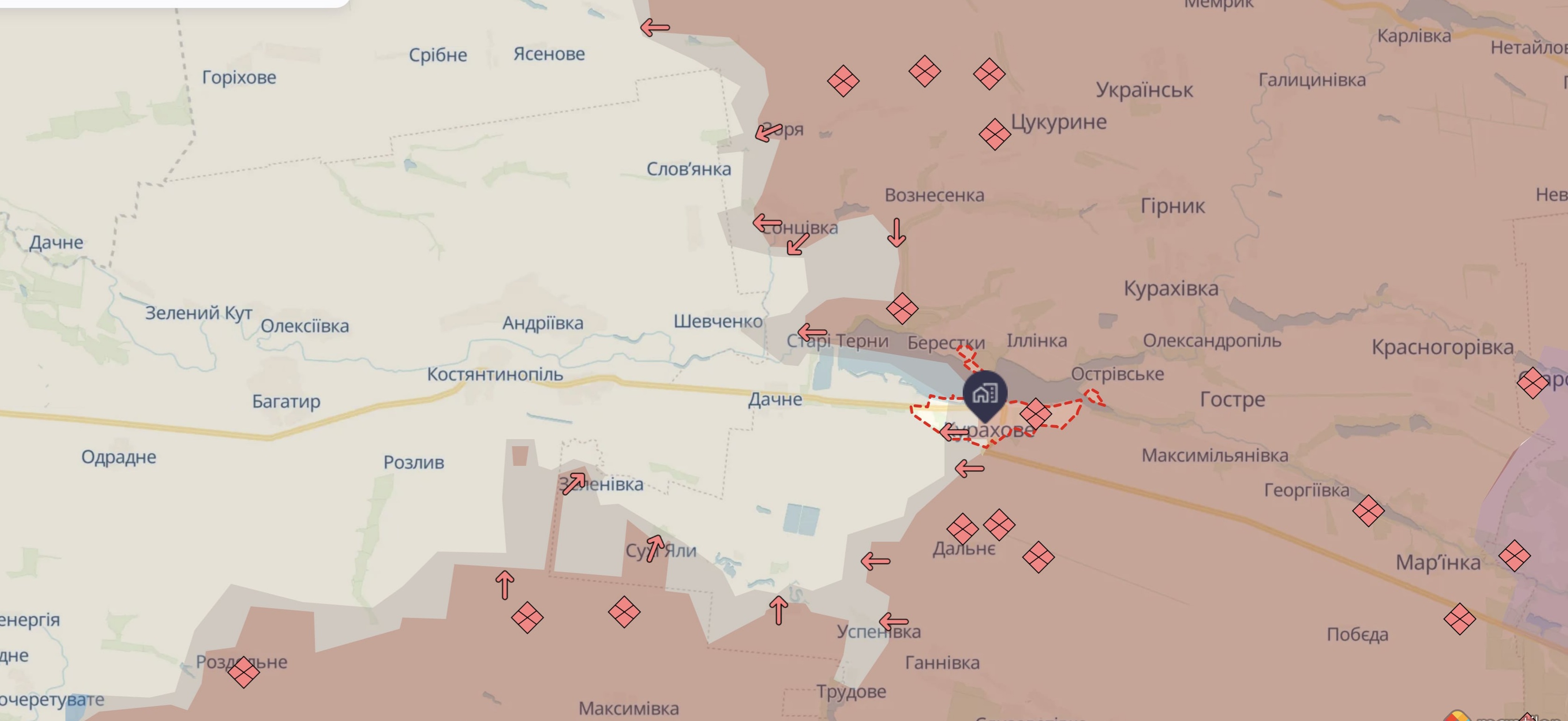 Украинский информационный ресурс DeepState несколько дней назад сообщал, что россияне вывесили свой флаг на помещении Кураховской городской рады и продолжают продвигаться, постепенно занимая центральную часть города. Командир взвода 24 отдельной штурмовой бригады "Айдар" Станислав Бунятов с позывным "Осман" заявил, что войска РФ перебросили часть резервов из покровского направления на кураховский, который постепенно "сыпется". Он назвал полную оккупацию Курахового только вопросом времени.