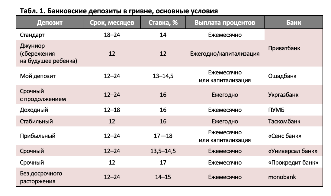 В первую очередь речь, конечно, о банковских депозитах (см. табл. 1). С учетом текущей инфляции говорить можно не столько о том, чтобы заработать, сколько о том, чтобы не потерять. На время военного положения государство гарантирует вкладчикам 100% возмещения депозита в случае банкротства банка. Но это не означает, что выбирать можно любой банк с самыми высокими процентами. И не только с точки зрения надежности самого банка. Наиболее выгодными депозитами являются так называемые вклады с капитализацией. Не будем нагружать вас расчетом сложных процентов, только отметим, что обычно, даже если ставки депозитов с капитализацией не самые высокие, их конечная прибыльность будет максимальной.