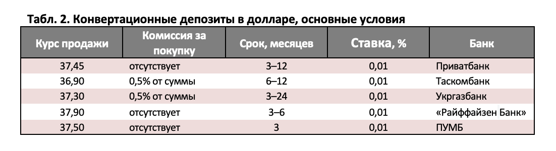 Депозиты в валюте вообще не привлекательны по процентам, наверное, самые интересные сейчас так называемые конвертационные депозиты, предусматривающие обмен гривни в валюту в момент оформления вклада. При возвращении вклада на руки клиент уже получит доллар или евро. Такие вклады фактически позволяют обменять гривни на валюту по более выгодному, чем в обменниках, курсу, в этом как раз и выгода. Соответственно, если за то время, пока деньги были на депозите, обменный курс изменится, вы ничего не потеряете (см. табл. 2). Впрочем, есть ограничение — оформить такой депозит можно на сумму не более 100 тыс. грн в месяц.