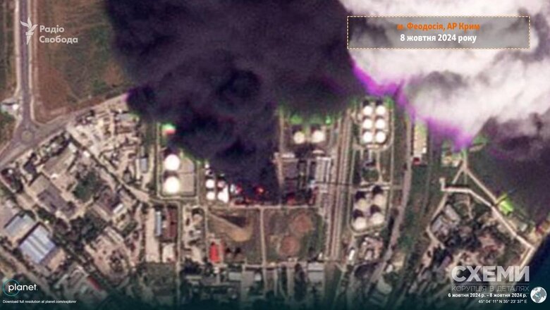 Во временно оккупированной Феодосии на крупнейшей в Крыму нефтебазе, которую 7 октября атаковали Вооруженные Силы Украины, продолжается масштабный пожар. Журналисты "Схем" обнародовали в Telegram снимки со спутника Planet Labs.